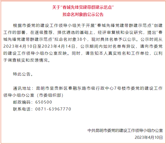 關(guān)于“春城先鋒黨建帶群建示范點(diǎn)”擬命名對(duì)象的公示公告根據(jù)市委黨的建設(shè)工作領(lǐng)導(dǎo)小組關(guān)于開展“春城先鋒黨建帶群建示范點(diǎn)”創(chuàng)建工作的部署,在逐級(jí)推薦、擇優(yōu)遴選的基礎(chǔ)上,經(jīng)評(píng)審復(fù)核和會(huì)議研究,提出“春城先鋒黨建帶群建示范點(diǎn)”擬命名對(duì)象38個(gè),現(xiàn)對(duì)具...